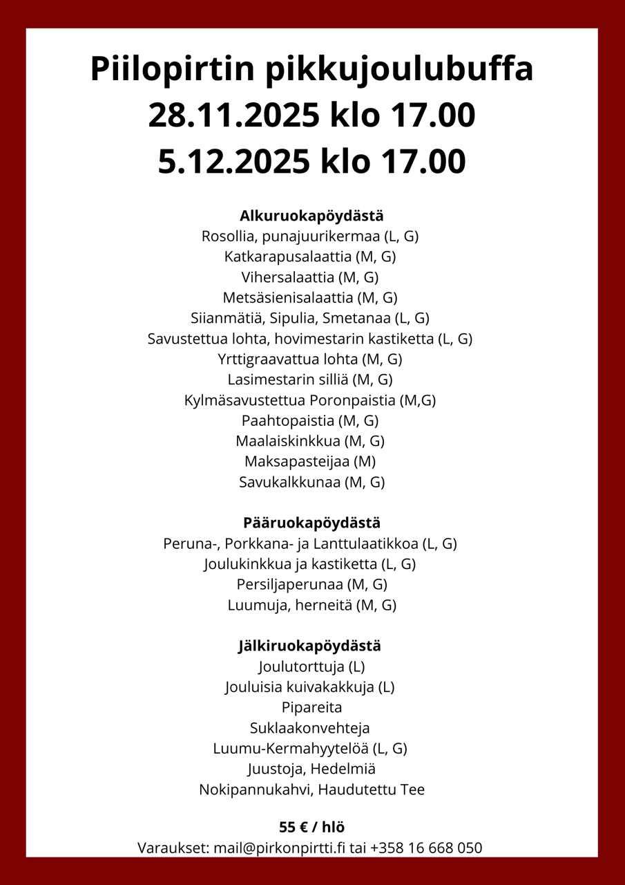 Piilopirtin pikkujoulubuffa avoinna 28.11.2025 ja 5.12.2025 klo 17.00 - 20.00, tarjolla on Lappilainen joulubuffee, hinta 55€/henkilö. Varaukset sähköpostitse Pirkon Pirttiin tai puhelimitse 016-668 050. Tervetuloa!